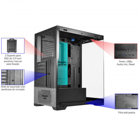 Placa-mae compativel: ATX, MICRO ATX, ITX. Dimensoes do chassi: (A*L*P) 420*227*370mm Dimensoes do gabinete: (A*L*P) 446*236*373mm Altura da CPU cooler: 180mm Suporte para placa de video: ate 350mm Fontes de alimentacao compativeis: padrao ATX Portas USB: 1USB2.0 + 1 USB3.2Gen1 TypeA Baias internas: Baia de 2.5¿¿ SSD *1 na vertical interna + (2 atras da placa mae com suporte com parafuso manual para fixacao) Slots de expansao: 07 Chassi 0,5mm Refrigeracao: Superior: 2 fans 120x120mm ou 2 de 140x140mm Traseira: 1 fan 120x120mm ou 1 de 140x140mm Interna: (PSU Cover): 1 fan 120x120mm ou 1 de 140x140mm Inferior: : 1 fan 120x120mm ou baia de 3.5¿ para HD Compativel com water cooler de 120mm traseiro ou 240mm superior (Fans Opcionais nao acompanham o produto, devem ser adquiridos separadamente)