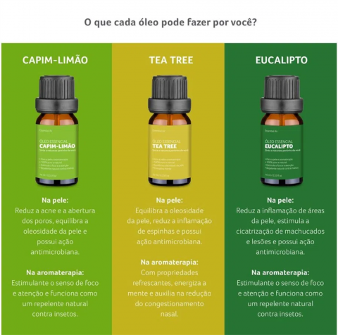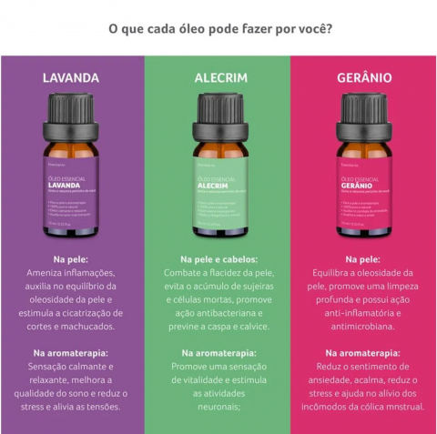 *Lavanda, Alecrim, Gerânio, Eucalipto, Capim-Limão e Tea Tree.