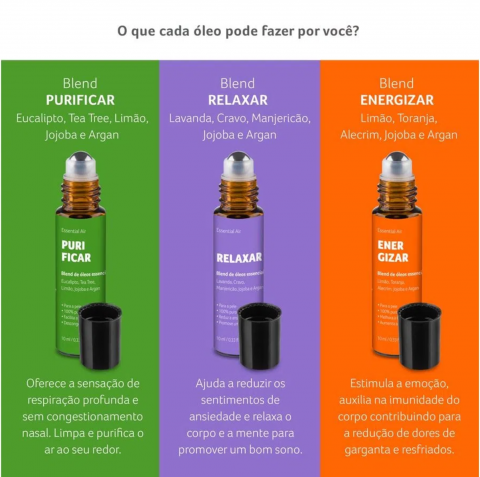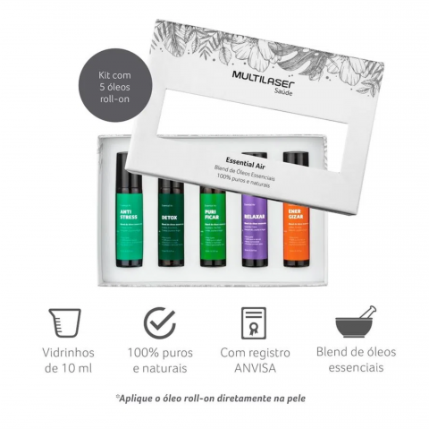 Acompanha 5 blends de 10ml: Anti-stress, Detox, Purificar, Relaxar e Energizar.