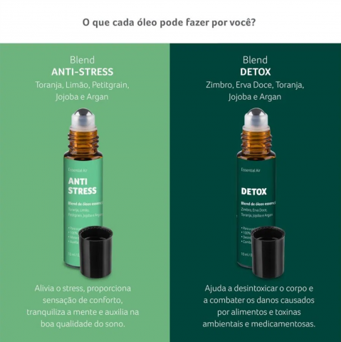 O Kit de óleos essencias roll-on proporciona experiências sensoriais mais intensas. Para passar diretamente na pele, os óleos são 100% puros, naturais e certificados pela ANVISA para que você se sinta seguro em usar os produtos.