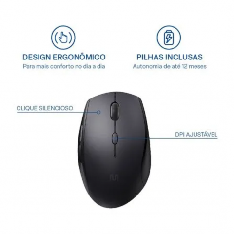 Imagina a praticidade de um mouse sem fio com alcance de até 10 metros, possibilitando maior flexibilidade e eliminação dos emaranhados de fios na sua área de trabalho. Graças à conexão 2.4GHz, a estabilidade é incomparável, proporcionando uma experiência suave e sem interrupções. E, para sua conveniência, incluímos uma pilha AA que garante uma incrível duração de até 12 meses, reduzindo a necessidade de trocas frequentes.