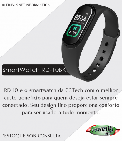 RD-10 e o smartwatch da C3Tech com o melhor custo beneficio para quem deseja estar sempre conectado. Seu design fino proporciona conforto para ser usado a todo momento. Diversas ferramentas diretamente no seu pulso, playlists, notificacoes, alem de controle de temperatura atraves de um sensor revolucionario. RD-10 foi desenvolvido para maximizar seu desempenho e priorizar um estilo de vida saudavel e ativo.
