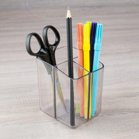Porta lapis de plastico com 3 divisorias. Fabricado em poliestireno PS. Livre de bisfenol-A BPA FREE.