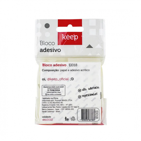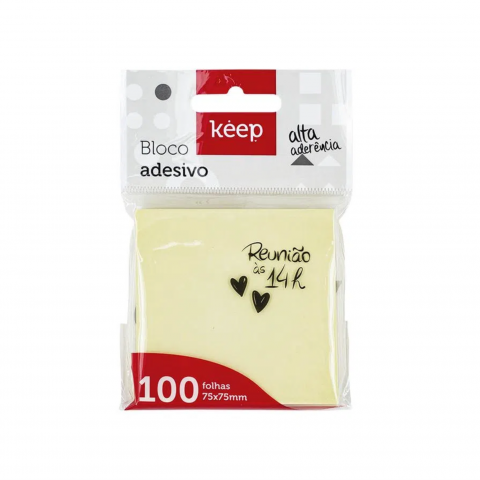 O Bloco Adesivo da Keep, é um conjunto de notas adesivas retangulares de tamanho 75x75mm, na cor amarela, com 100 folhas que podem ser reposicionadas sem danificar a superfície onde foram aplicadas.