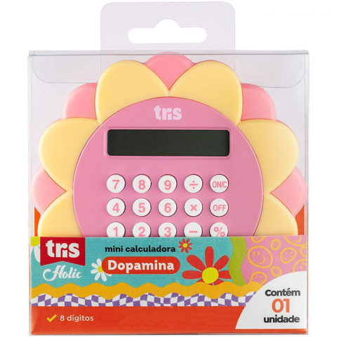 A dose de felicidade do seu dia! Inspirada na tendência dopamine fashion, a coleção Dopamina conta com cores vibrantes, estampas divertidas e muita abstração! A calculadora mini Dopamina e supeeer fofa, com formato de flor. E compacta, pratica e estilosa. Conta com 8 dígitos e carregamento por bateria alcalina LR1130.