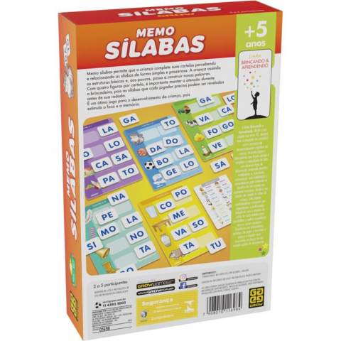 Um jogo de memoria em que a criança constrói as palavras silaba por silaba. Dessa forma, ela vai assimilando as estruturas básicas das palavras mais simples. Memoria Si-la-bas permite a criança o contato com a formação das silabas em cada palavra de forma divertida, as crianças completam suas cartelas, raciocinando sobre a relação da figura com a palavra escrita.