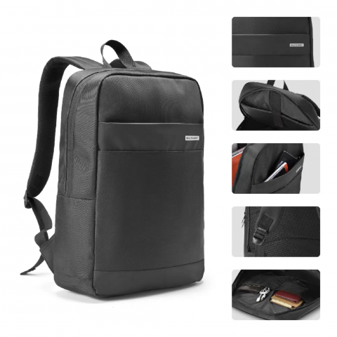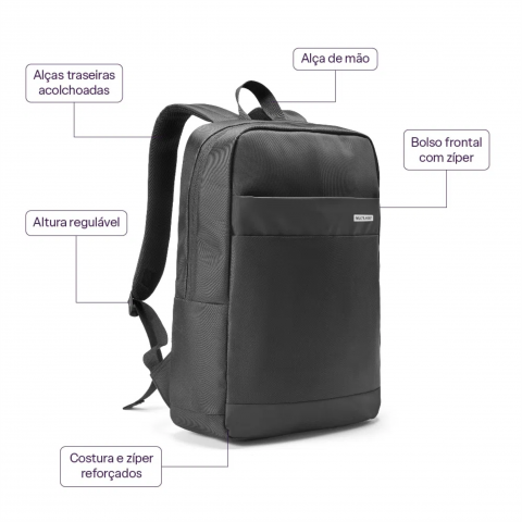 Feita em poliéster resistente e material sintético, com design elegante. Conta com compartimento acolchoado para notebooks até 15,6", além de bolsos laterais e bolso frontal para acessórios.